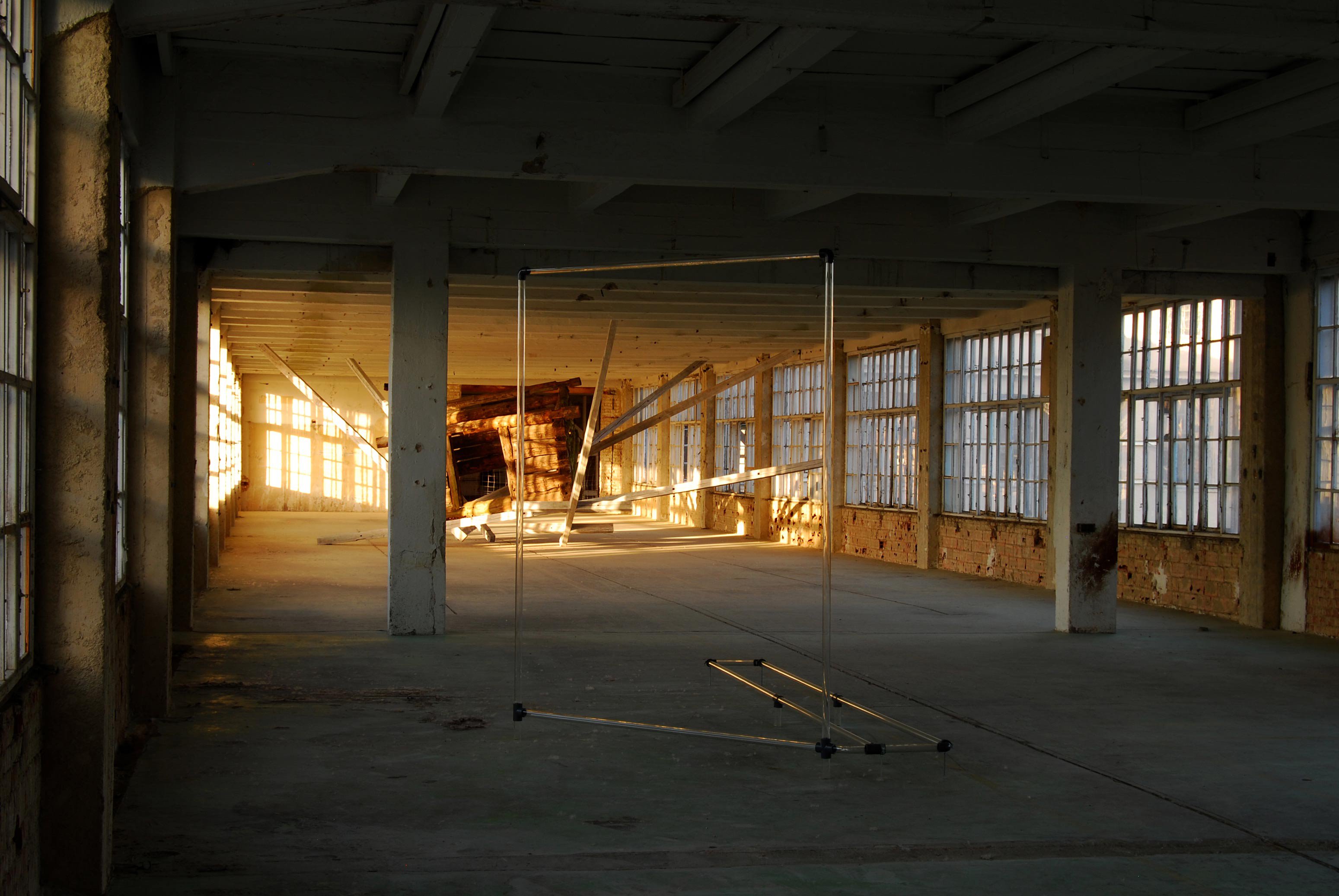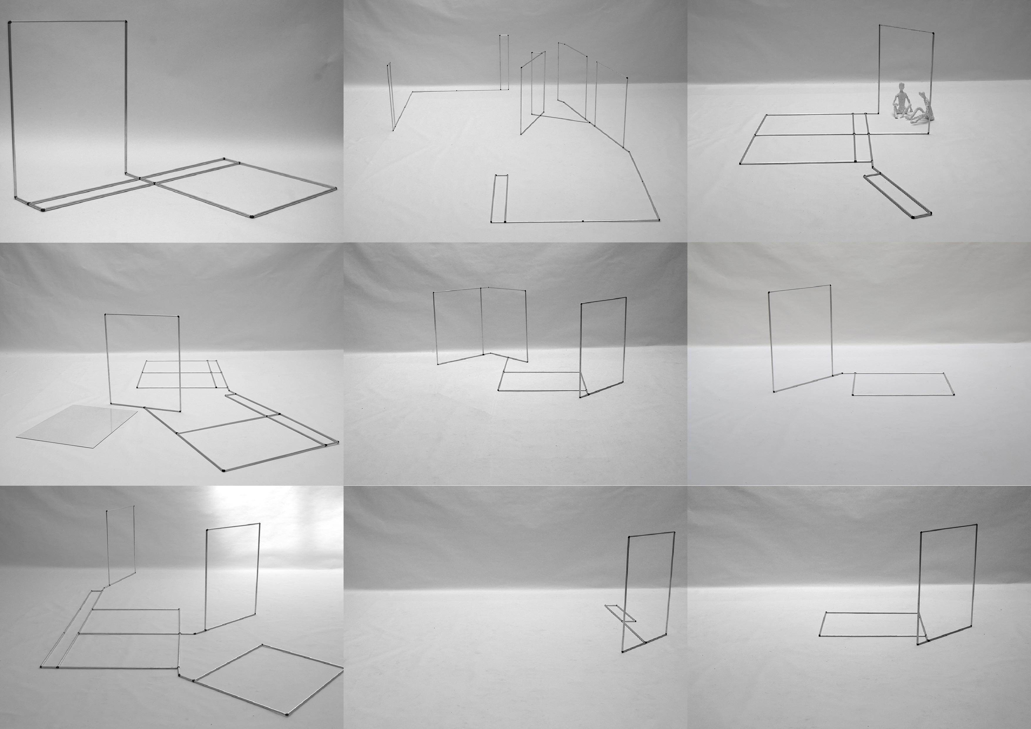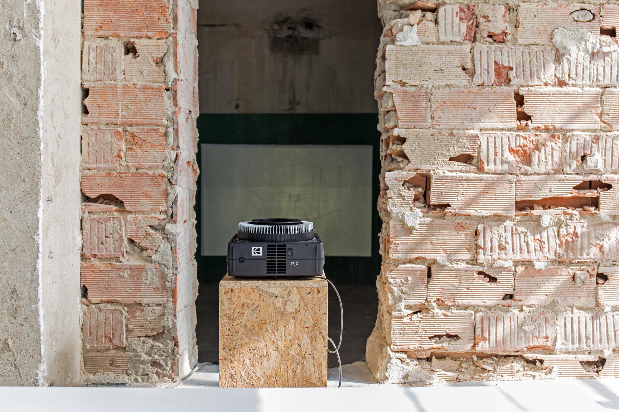 "Spaces Elsewhere" is a site-specific installation in a factory hall dedicated to demolition. It is the representation of an imaginary architecture whose only really material surface was the water level. The installation included the projection of 80 diapositives showing the different possible variations of the models.