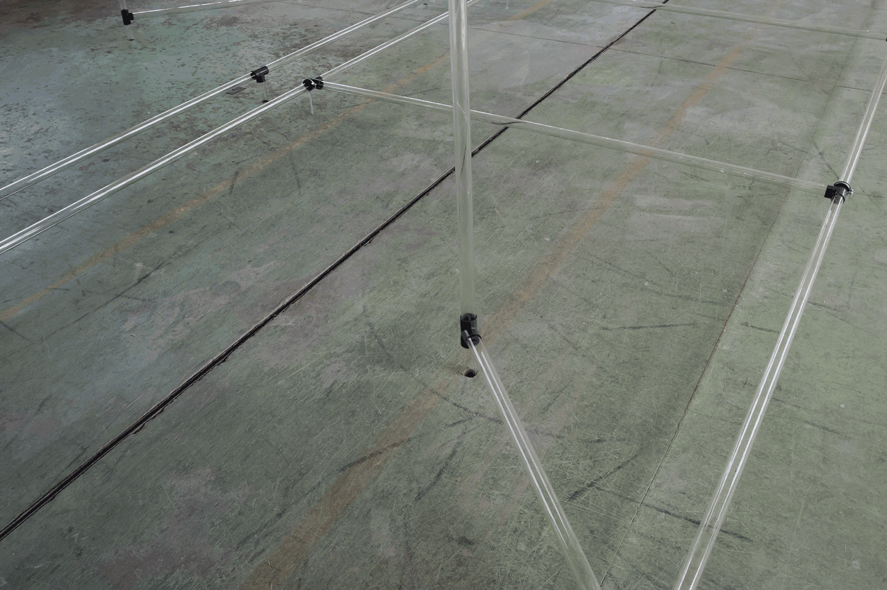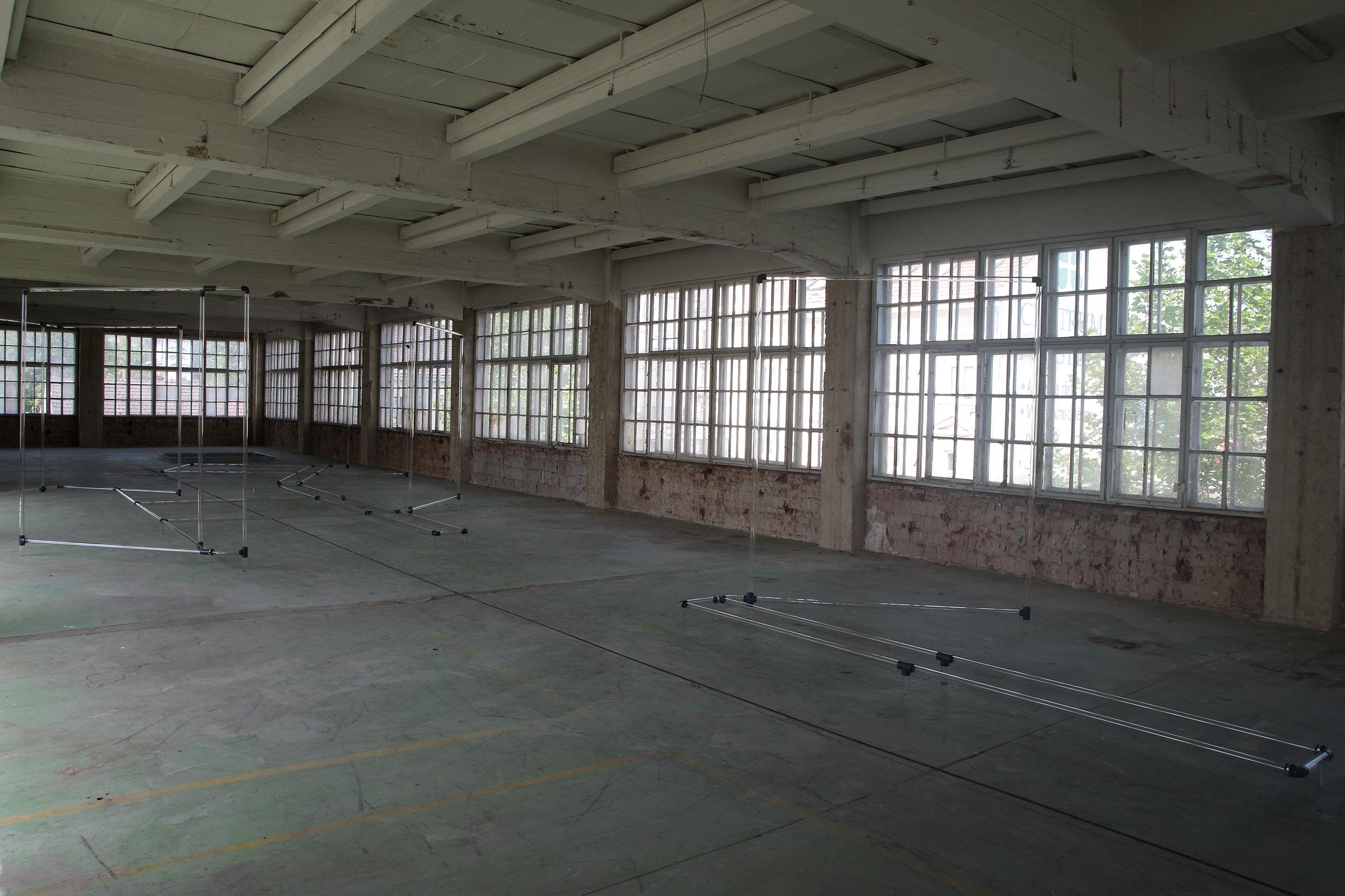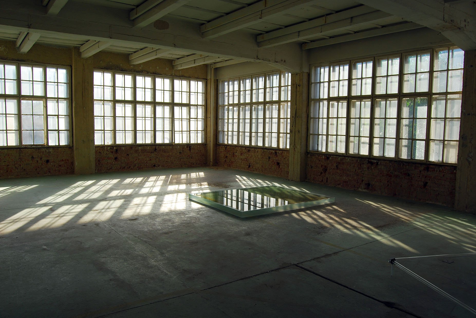 "Spaces Elsewhere" is a site-specific installation in a factory hall dedicated to demolition. It is the representation of an imaginary architecture whose only really material surface was the water level. The installation included the projection of 80 diapositives showing the different possible variations of the models.