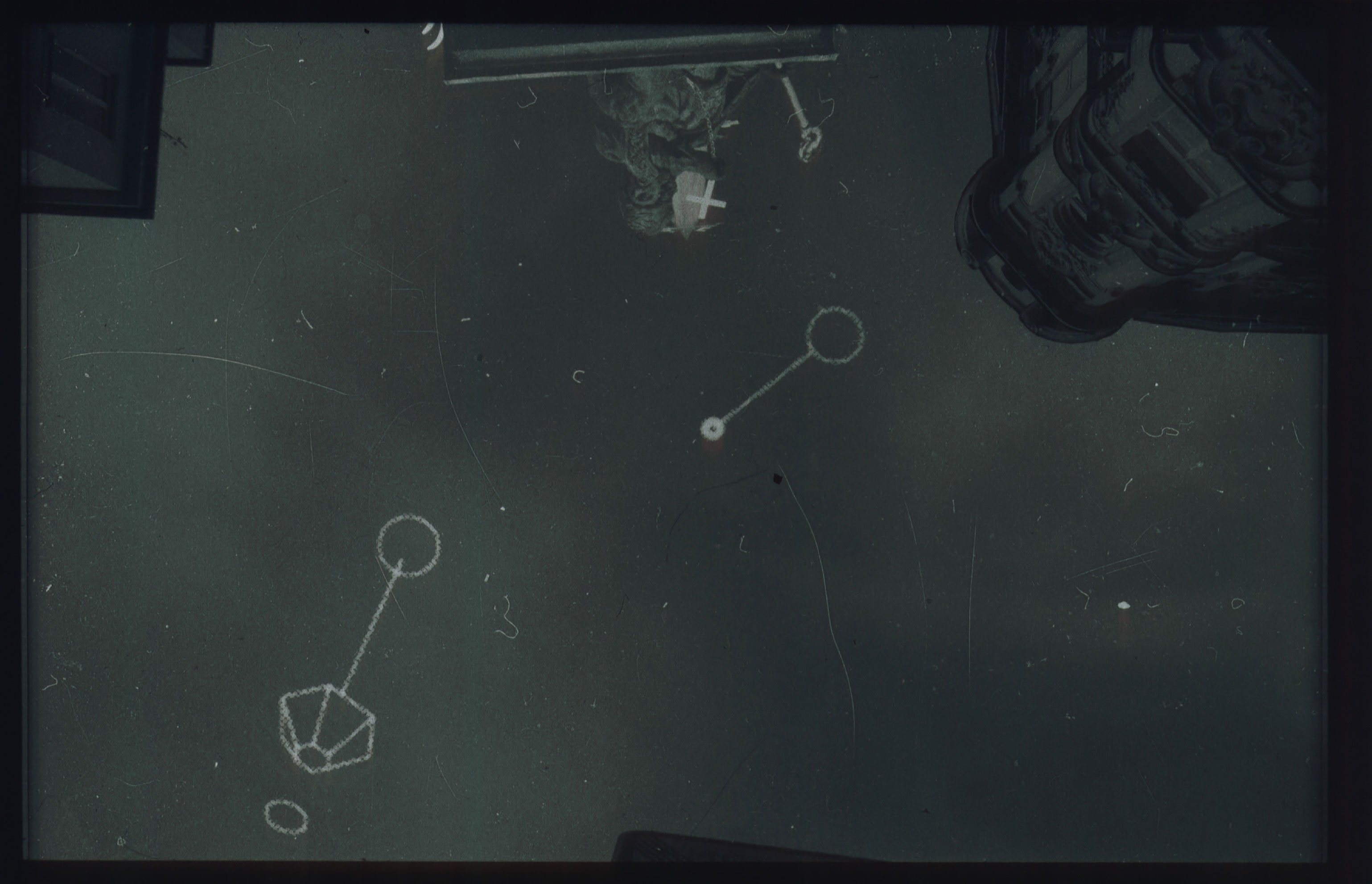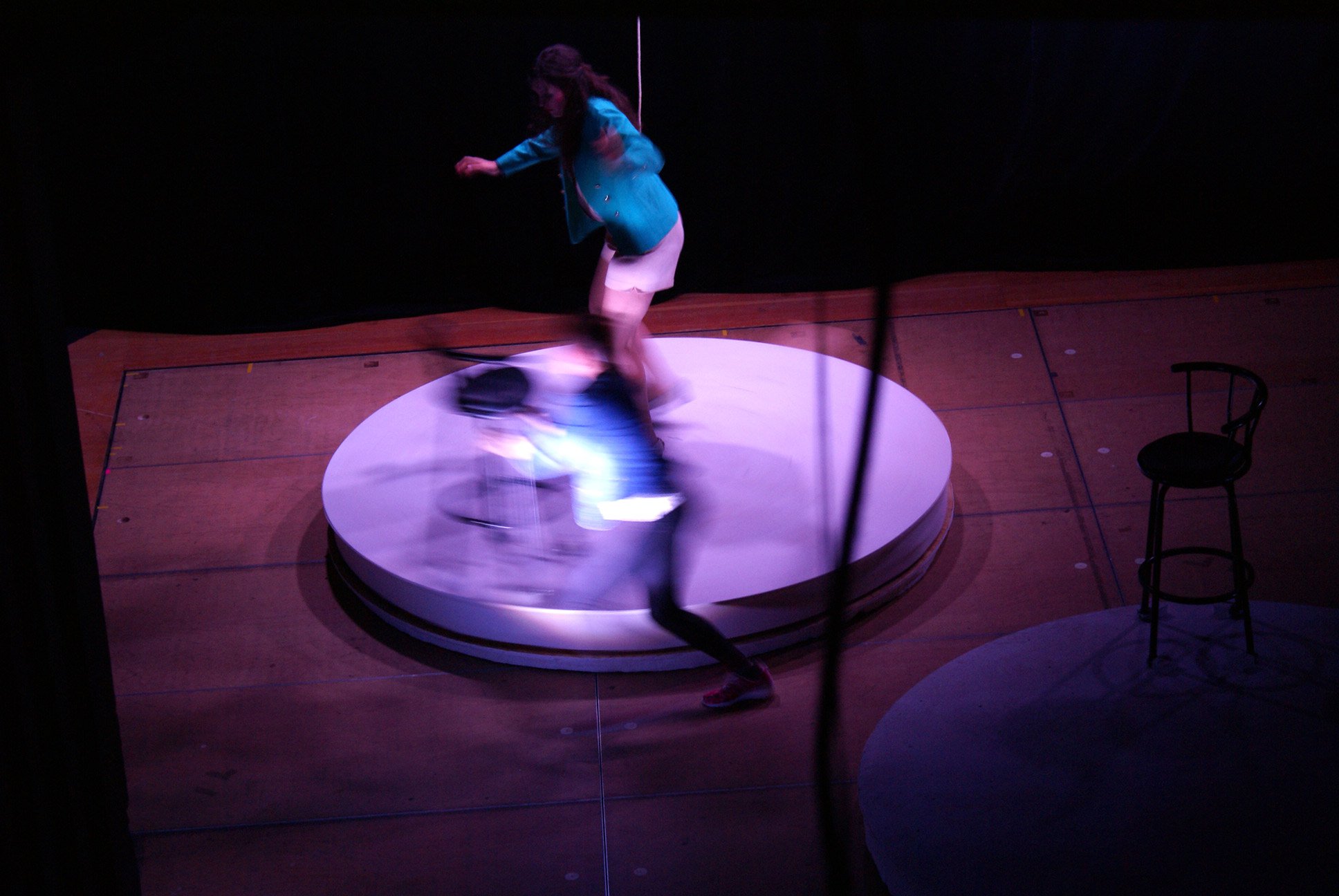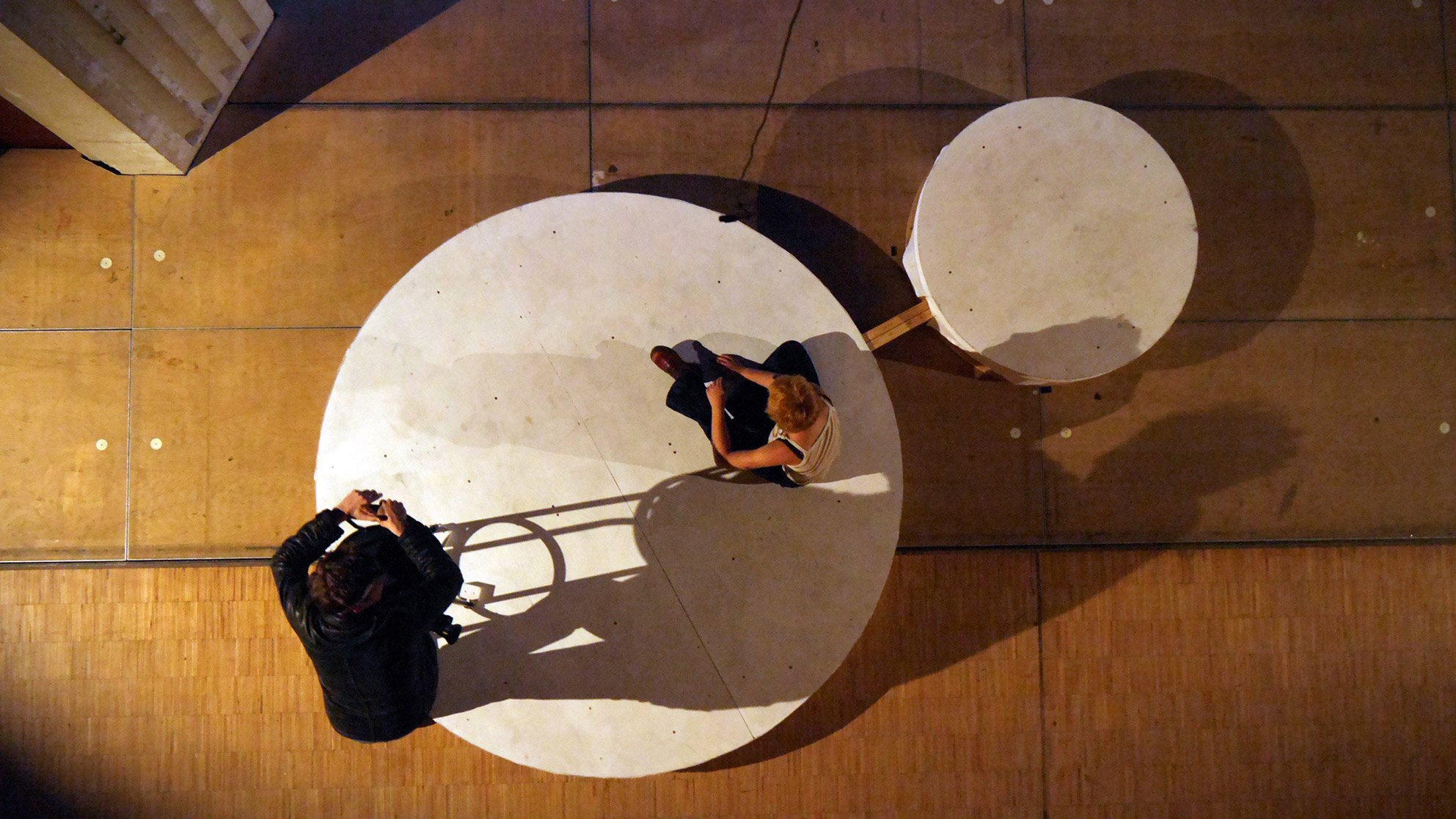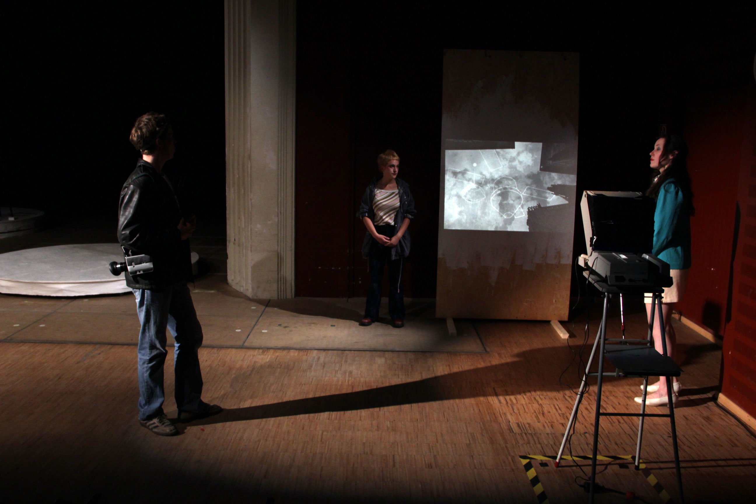 There are three images dominating the scene (the series has three parts). Two in front of the door are slide projections as a illustration of the book, and a third one on the stage floor consisting of two revolving platforms. These symbolize both the halo above the icon that plays the central role in the plot and the revolving planets in dreams about flying to space.