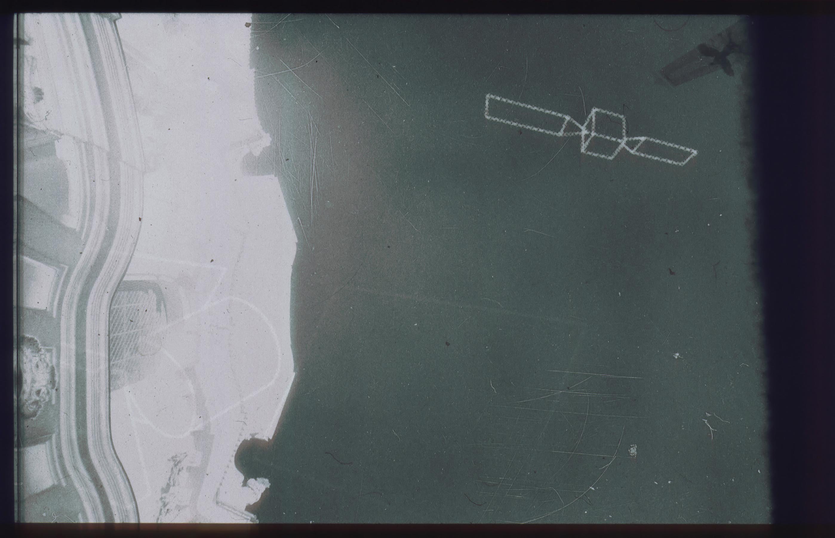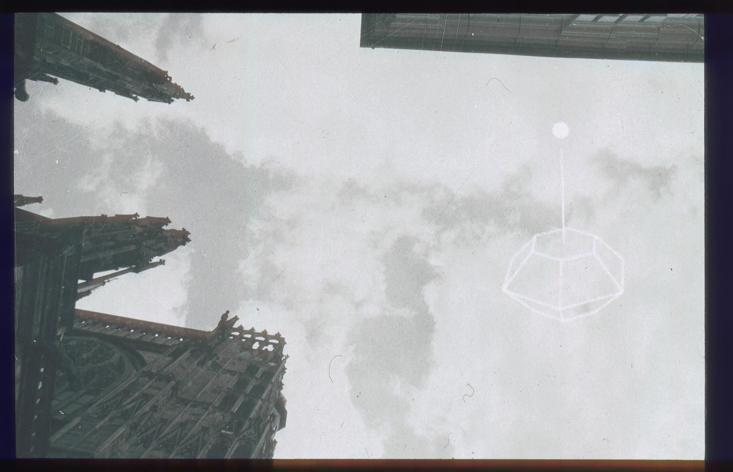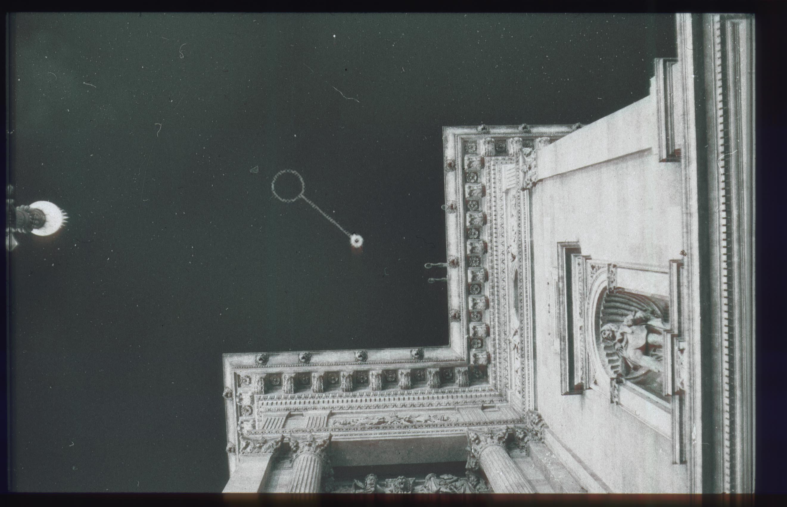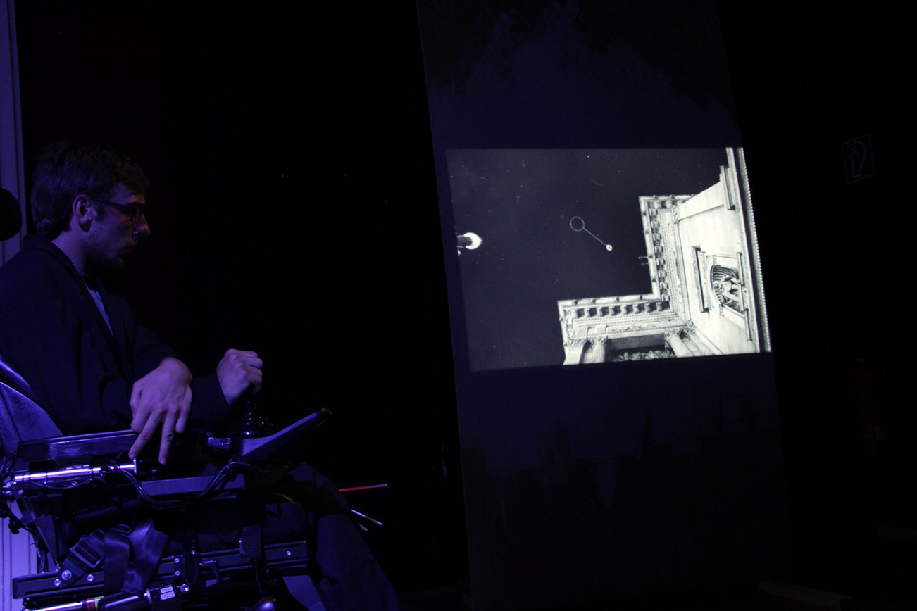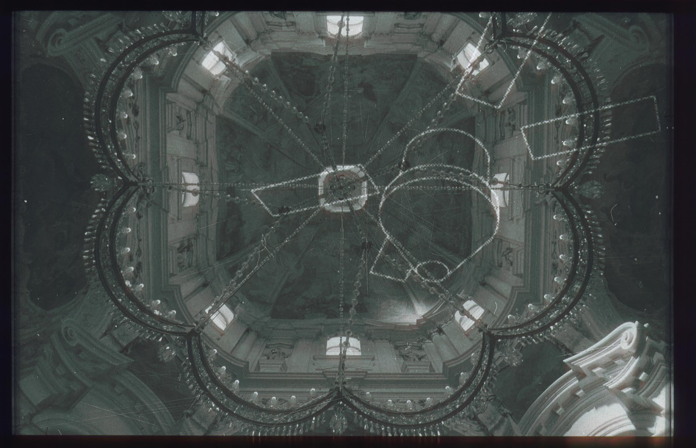 There are three images dominating the scene (the series has three parts). Two in front of the door are slide projections as a illustration of the book, and a third one on the stage floor consisting of two revolving platforms. These symbolize both the halo above the icon that plays the central role in the plot and the revolving planets in dreams about flying to space.