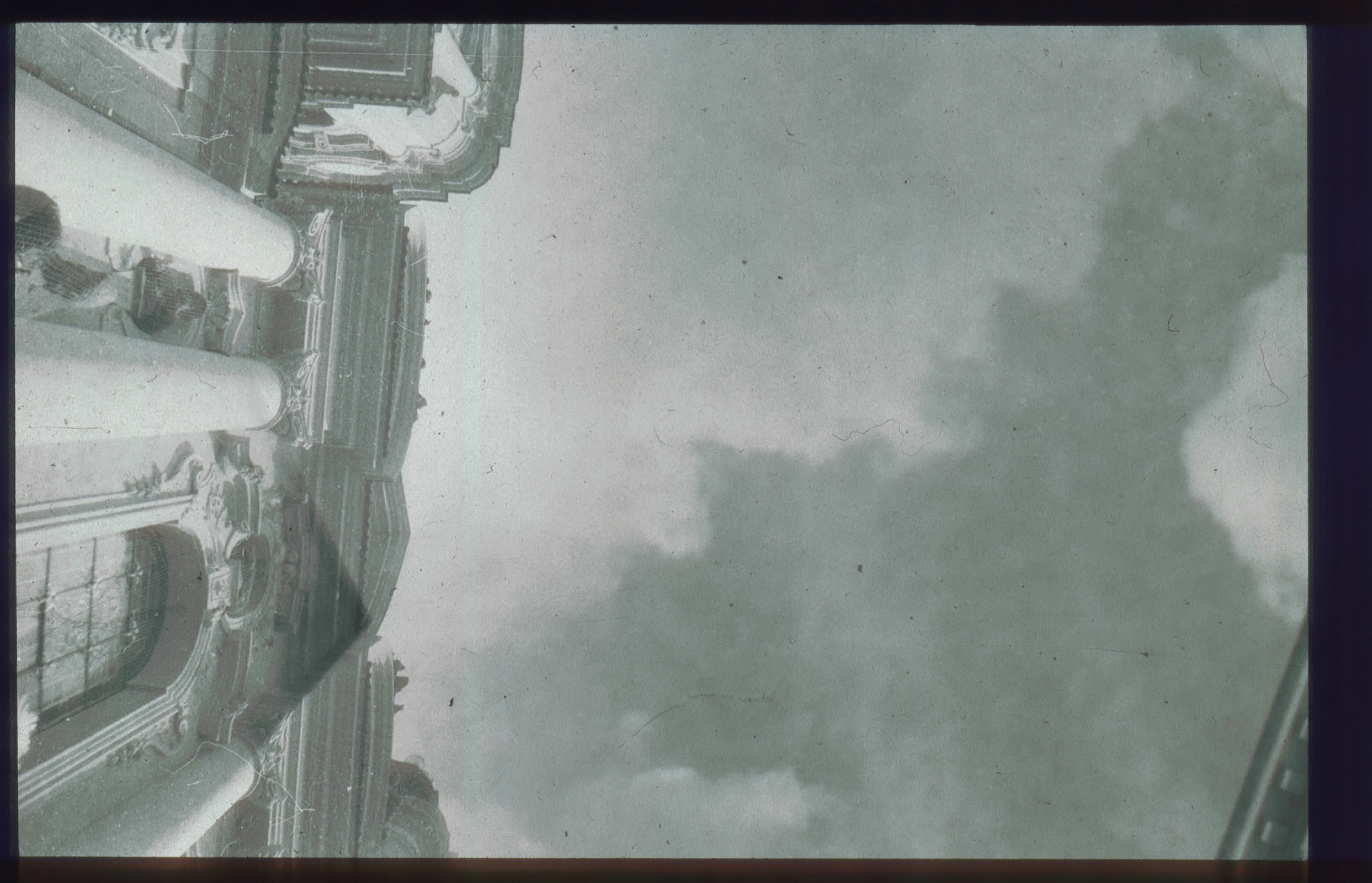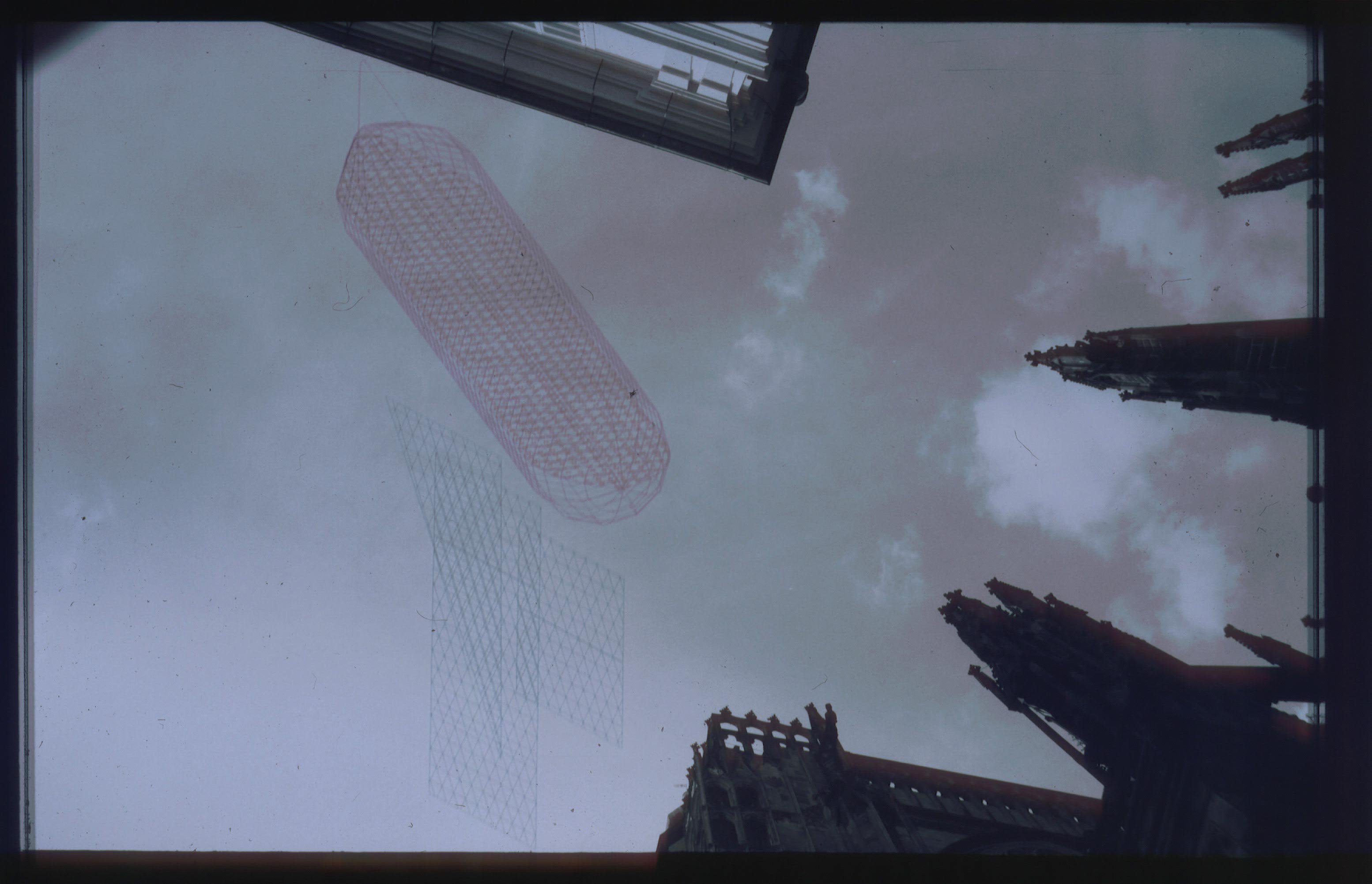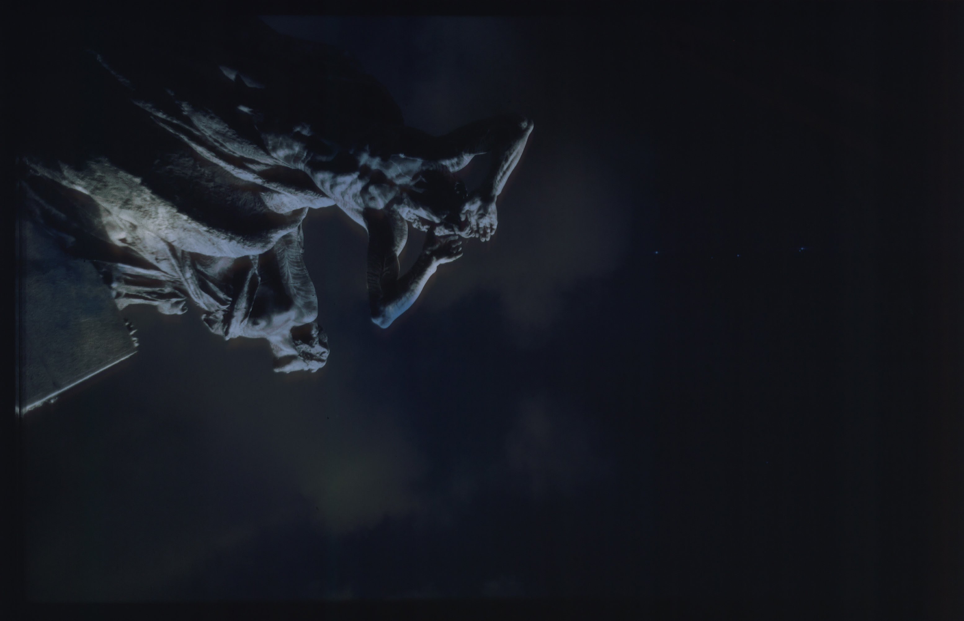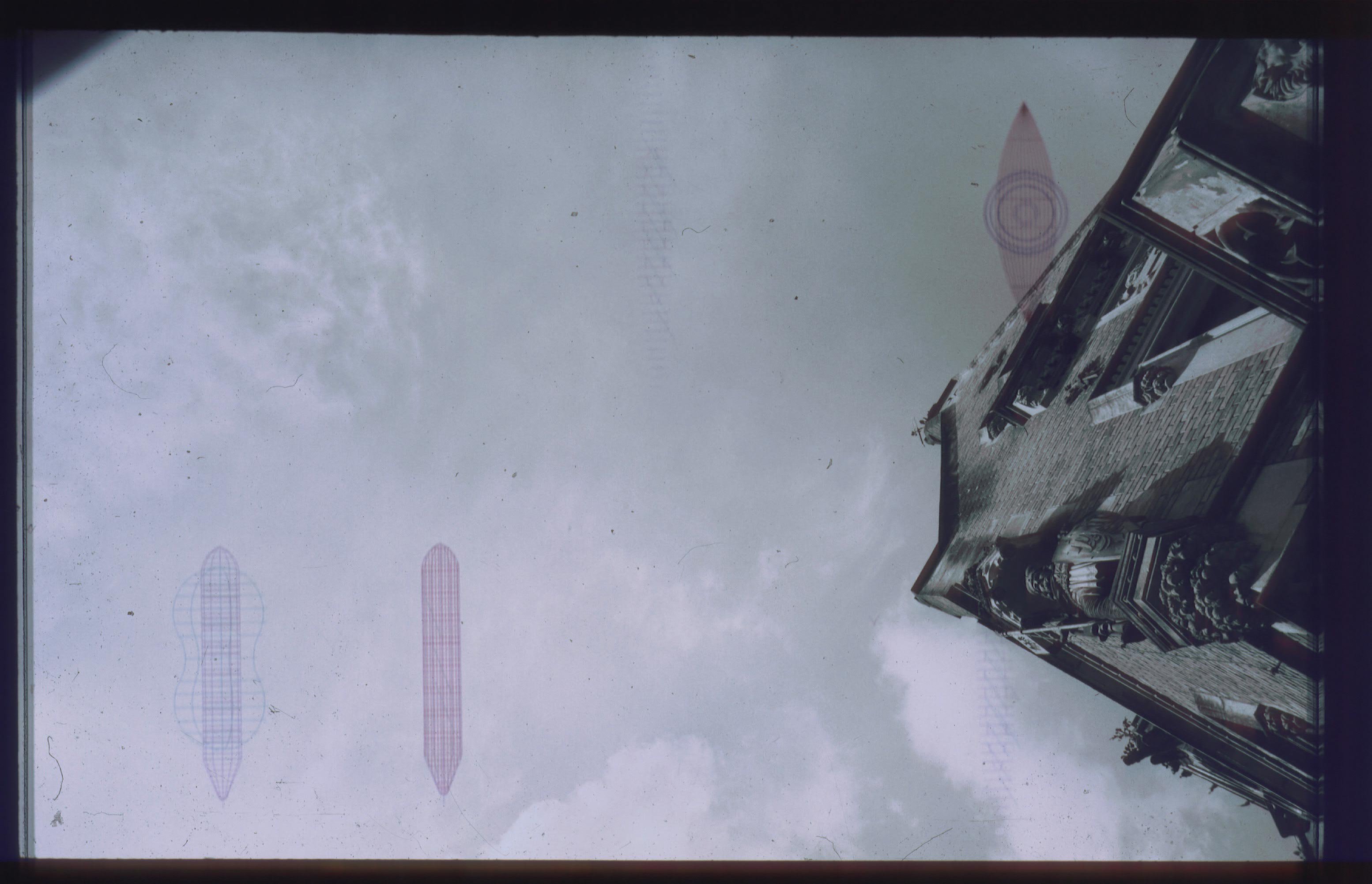 There are three images dominating the scene (the series has three parts). Two in front of the door are slide projections as a illustration of the book, and a third one on the stage floor consisting of two revolving platforms. These symbolize both the halo above the icon that plays the central role in the plot and the revolving planets in dreams about flying to space.